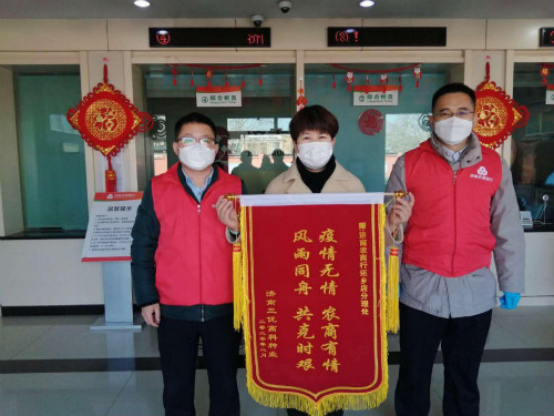 图2:济南三优高科种业张经理向济南农商银行历城支行献上锦旗