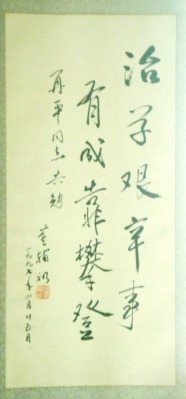 1997年,从武汉大学来北京工作的刘双平同志让我请董老师为他题写一个条幅,当我和双平去取条幅时,没想到他给我也写了一幅:“治学艰辛事,有成靠攀登”。这正是我的导师对我的殷切期望!我把这个条幅挂在墙壁,作为我的座右铭。