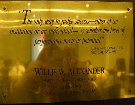 在其主会议室挂着美国银行家协会1969-1985年执行副主席Willis W. Alexander的画像,旁边铜牌上刻有他的一句格言,英文照录如下: