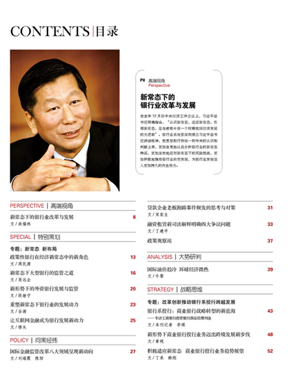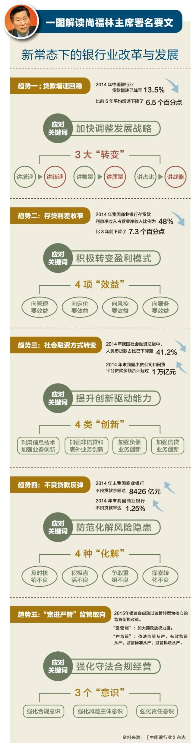 在去年12月份中央经济工作会议上,习近平总书记明确指出,“认识新常态,适应新常态,引领新常态,是当前和今后一个时期我国经济发展的大逻辑”。银行业系统要深刻领会习近平总书记讲话精神,把思想和行动统一到中央的认识和判断上来,更加自觉地认真分析银行业的新常态特征,更加主动地应对新常态下的风险挑战,更加积极地推动银行业转型发展,为银行业发展注入更加持久的内生动力。