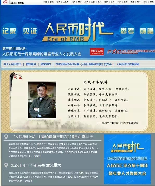 新华社中国金融信息网7月18日在人民大学隆重举办人民币汇率改革十周年高峰论坛,本人未能参会,应邀为是次“会议特刊”撰写了“汇改十年献辞”,献辞文字如下: