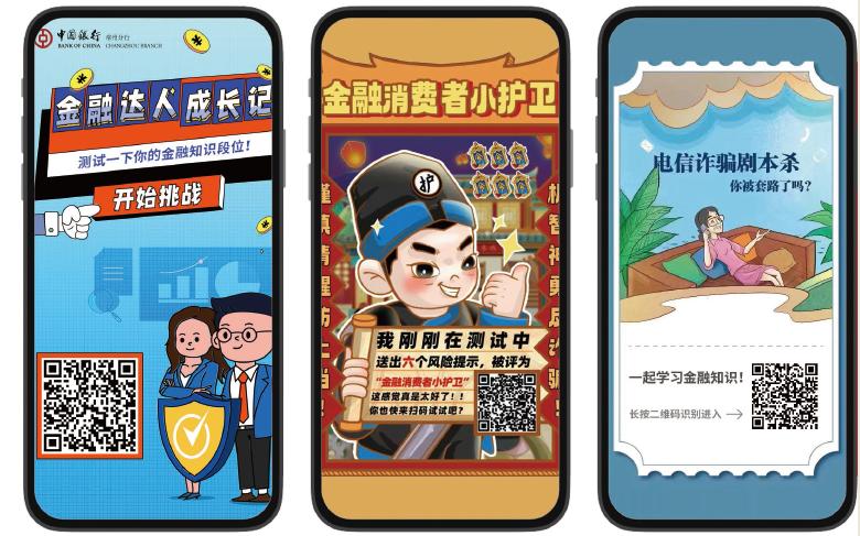 为提升宣传效能,推动金融安全教育入脑入心,中国银行常州分行金融教育示范基地创新宣讲形式,在原有的金融教育活动基础上,创作了“警惕跨境诈骗”、“非法集资 同防共治”、“钱袋子保卫战”等10个原创视频,以及“保护个人金融信息”、“帮信罪”等12个原创漫画,通过微信小程序、微信朋友圈、微信公众号、微信视频号及抖音平台等渠道进行传播推广,微信小程序“龙城荟”定期推送金融知识和金融教育活动,进一步扩大了金融知识宣传覆盖范围。
