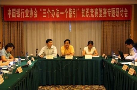 2010年9月10日,“三个办法一个指引”知识竞赛复赛专题研讨会在北京召开。会议由中银协教育培训部冯蓬蓬主任主持,中国银行业协会陈远年秘书长出席会议并讲话,银监会办公厅及政策法规部相关负责人到会指导。来自上海、黑龙江、山东、四川、陕西、深圳六家知识竞赛复赛承办银行业协会(同业公会)的相关负责人参加了会议。
