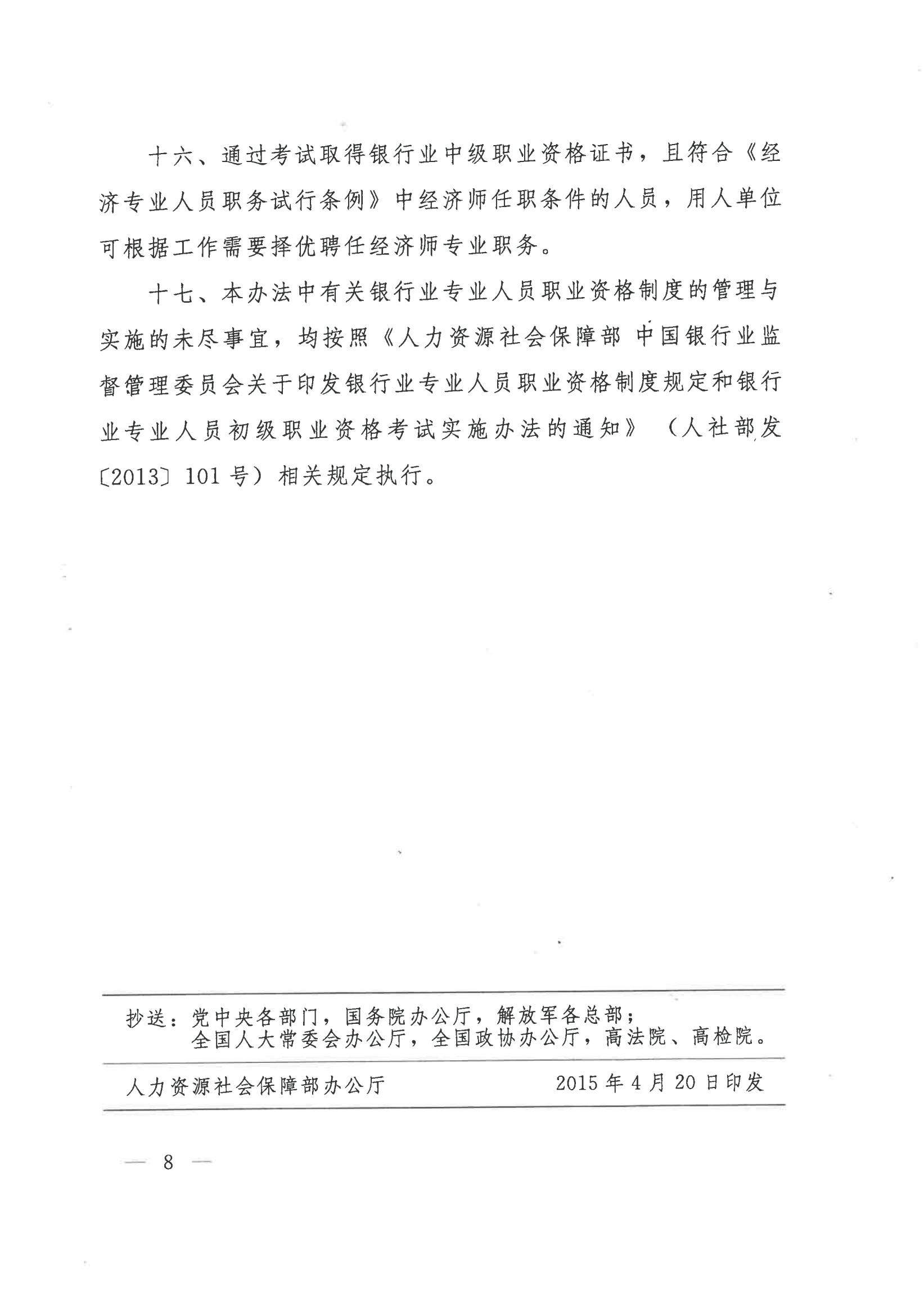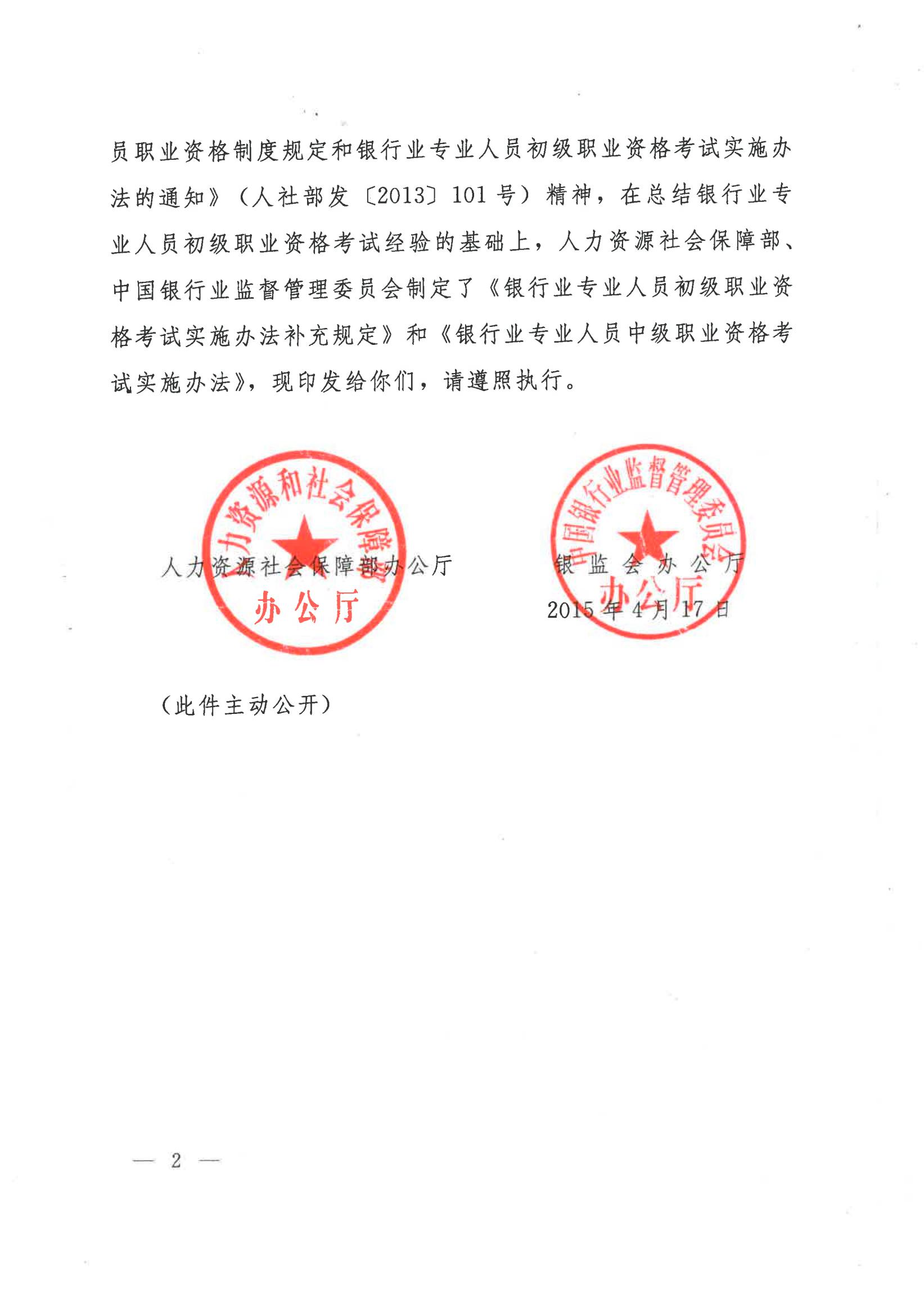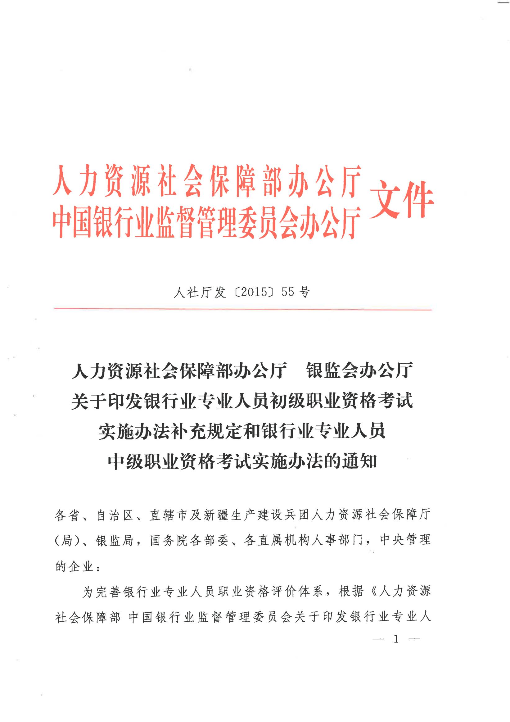 人社部办公厅 银监会办公厅 关于印发银行业专业人员初级职业资格考试实施办法补充规定和银行业专业人员中级职业资格考试实施办法的通知(人社厅发〔2015〕55号 )