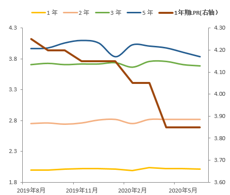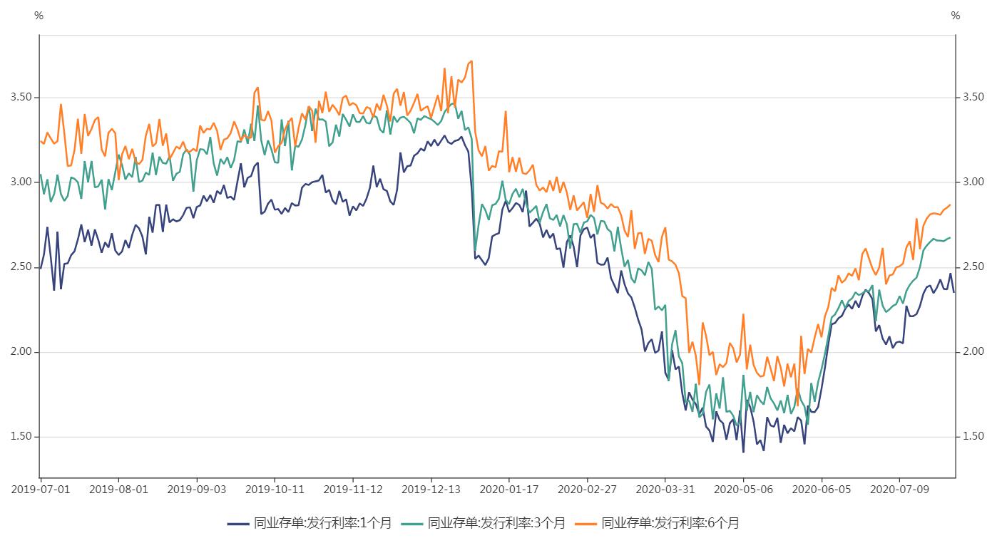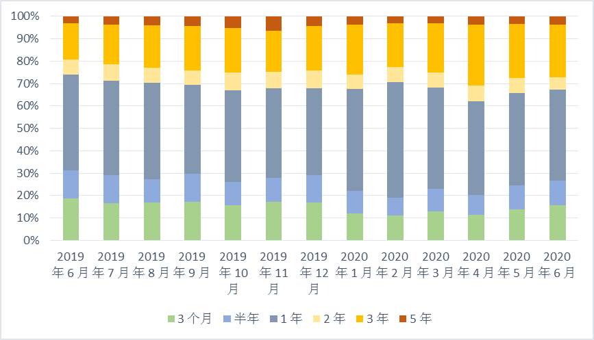 LPR下行对一般性存款利率有一定传导,但存款期限变化存在对冲效应。今年以来,国有商业银行和股份制商业银行主动压降3年期、5年期大额存单发行规模和利率。《2020年第二季度货币政策报告》指出,6月国有大行、股份制银行大额存单加权利率分别较2019年下降30、34个基点,利率明显下行,LPR传导效果显现。