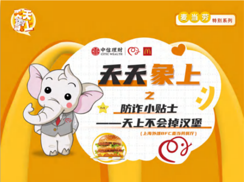 在场景建设方面,结合BFC麦当劳的实际情况,餐厅内部装饰以信银理财小暖象形象为主题,通过墙面装饰、柜台装饰、桌贴、吊旗等多种形式,向进店的消费者普及防非反诈与理性投资的知识,为顾客提供一个轻松愉快的理财学习环境。