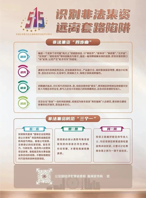 2024年5月15日是全国公安机关第15个打击和防范经济犯罪宣传日,“与民同心、为您守护”,打击经济犯罪,防范金融风险,维护经济秩序,是“5·15”永恒的主题。