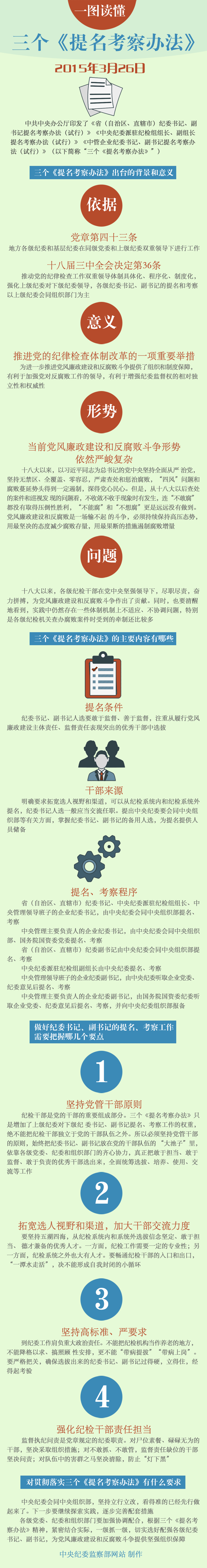 近日,经中央全面深化改革领导小组会议审议,中共中央办公厅印发了《省(自治区、直辖市)纪委书记、副书记提名考察办法(试行)》、《中央纪委派驻纪检组组长、副组长提名考察办法(试行)》、《中管企业纪委书记、副书记提名考察办法(试行)》。