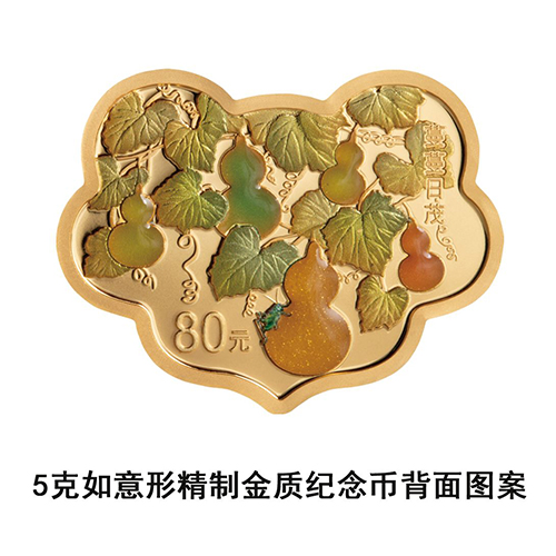5克如意形金质“蔓蔓日茂”纪念币背面图案为葫芦、藤蔓、蝈蝈等装饰组合设计,并刊“蔓蔓日茂”字样及面额。