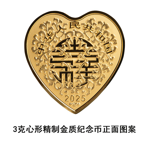 3克心形金质“永结同心”纪念币背面图案为吉祥鸟、吉祥花卉等装饰组合设计,并刊“永结同心”字样及面额。