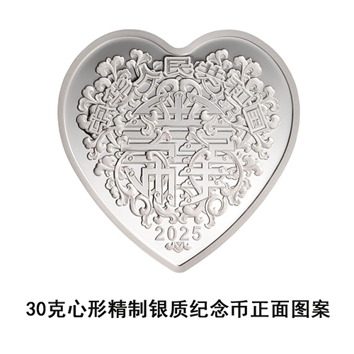 30克心形银质“永结同心”纪念币背面图案为袍袖、“囍”字、吉祥纹样等装饰组合设计,并刊“永结同心”字样及面额。