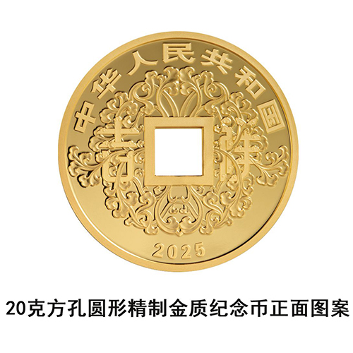 20克方孔圆形金质纪念币为精制币,含纯金20克,直径30毫米,内孔6毫米×6毫米,面额300元,成色99.9%,最大发行量2000枚。