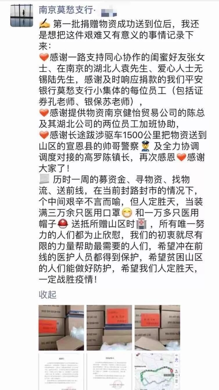 疫情发生以来,平安银行各地分行快速行动,以多种方式与客户一起联手抗疫。在这其中南京分行与三位客户齐心协力共同捐赠30000余只口罩和10000多只医用帽子送抵湖北贫困山区医院,极大缓解了当地医疗物资压力。