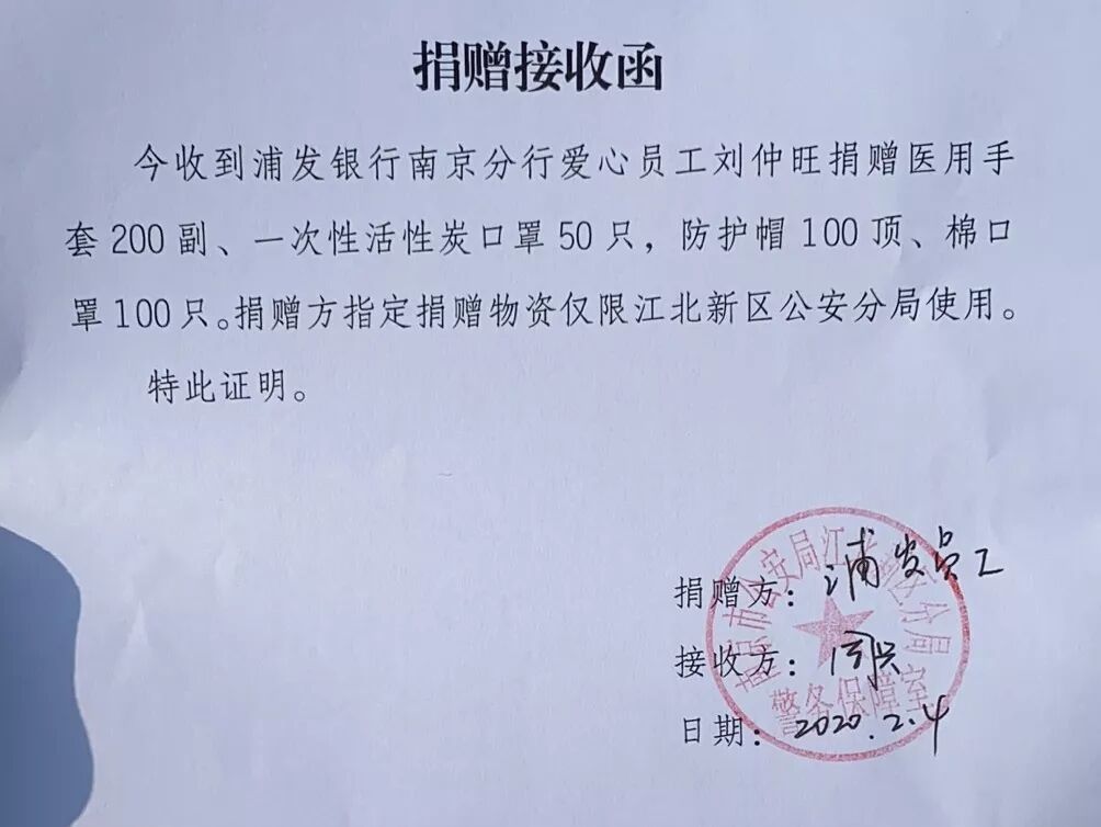 分局工作人员说,我们需要开收据,捐赠方怎么写?小刘说,就写“浦发银行南京分行爱心员工”吧!