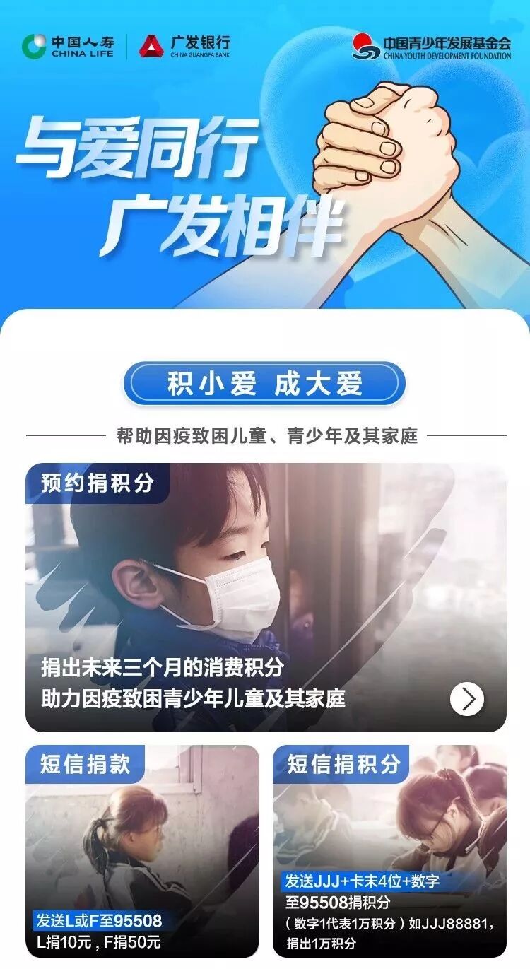 近日,依托 "抗击疫情,希望同行——广发希望慈善基金特别行动",广发信用卡率先启动对因疫致困儿童、青少年及其家庭的专项募捐,以期在疫情结束后对该类受影响人群进行长期的关注和帮扶。在号召大家捐款的同时,广发信用卡还在业内率先将信用卡积分与捐助结合起来,只要发送短信即可把小小积分当成大大爱心奉献出去。