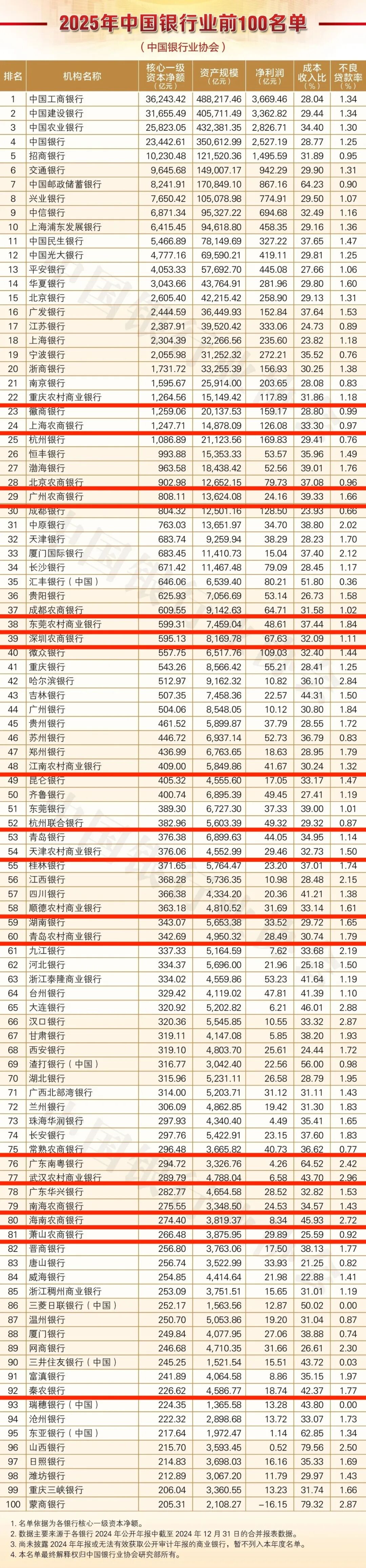 相较于2024年17家农商银行上榜情况,入选2025“中国银行业前100名单”的农商银行数量有所增长,其中,2024年完成全省统一法人的海南农商银行新入围今年“全国百强”。本次入选的100家银行包括6家大型商业银行、12家全国性股份制商业银行、56家城市商业银行、18家农村商业银行、2家民营银行和6家外资法人银行。榜单按照2024年末国内商业银行核心一级资本净额对商业银行进行排序,并对各家银行的经营规模、盈利能力、运营效率及资产质量进行综合展示。据悉,中国银行业协会已连续十年发布“中国银行业100强榜单”。作为我国银行业金融机构的核心组成部分,这100家代表性银行对于我国经济高质量发展、建设强大的金融机构、实现金融强国目标具有重大意义。中小银行通过改革化险和市场化重组不断提升竞争力,56家城市商业银行和18家农村商业银行核心一级资本净额分别同比增长9.53%和9.67%。与此同时,头部民营银行发展态势良好,依托金融科技优势实现业务拓展,展现出数字金融的创新活力。外资银行发展保持平稳,6家主要外资法人银行核心一级资本净额合计1902.23亿元,同比增长5.72%;总资产规模1.60万亿元,同比增长3.78%。