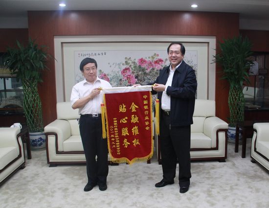 2013年9月13日,中国银行业协会专职副会长会见中国银行湖南省分行行长、党委书记赵蒙一行5人,并代表中国银行业协会接受中国银行湖南省分行赠送“金融维权、贴心服务”锦旗。